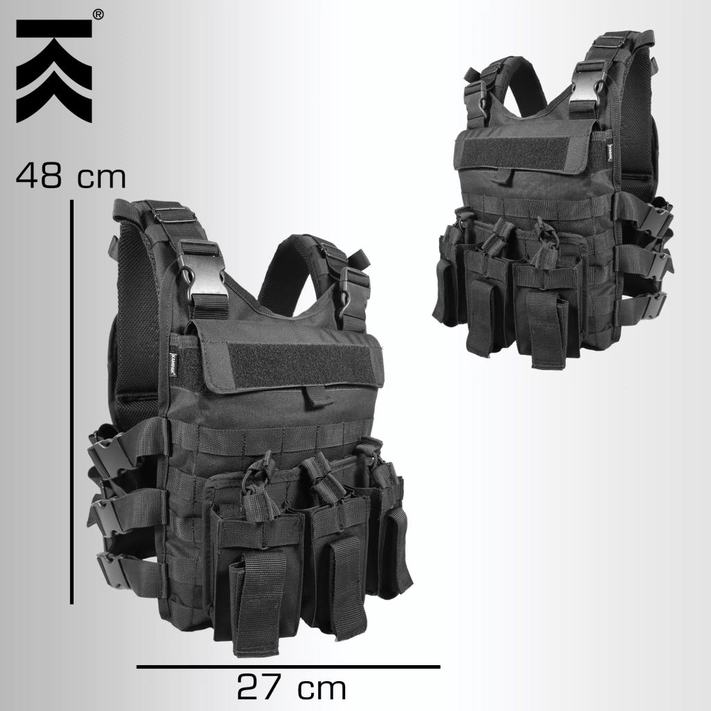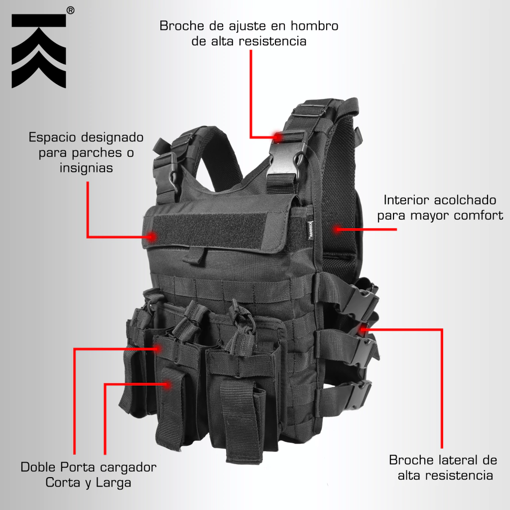 • 3 porta cargadores triples, 6 p/cargador arma larga, 3 p/cargador arma corta.