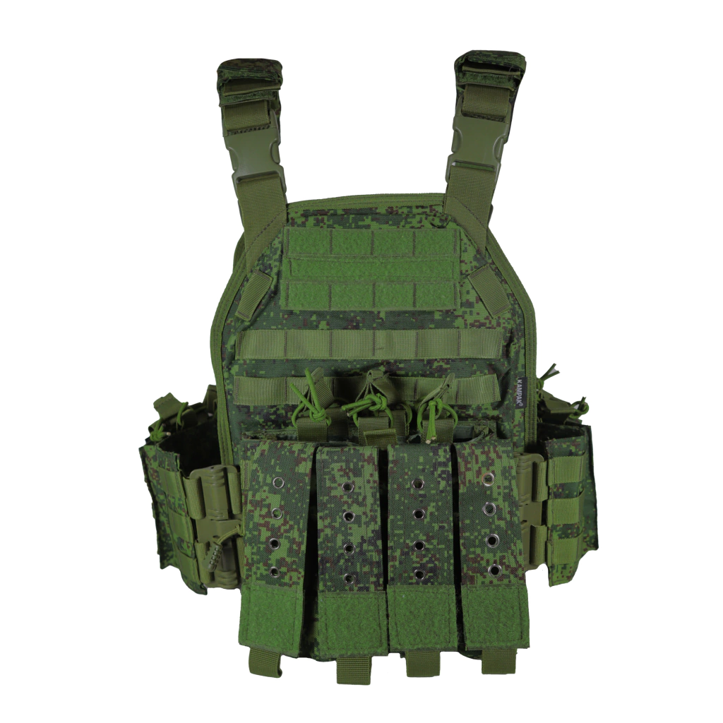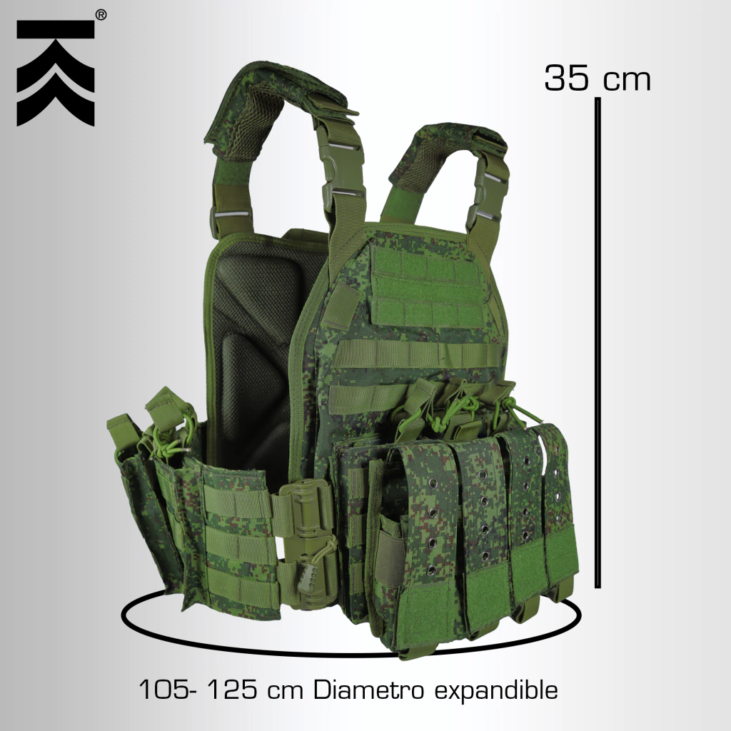 *7 porta cargadores p/arma larga (3 frontales, 4 laterales) + 6 porta cargadores arma corta (4 delanteros, 2 laterales)